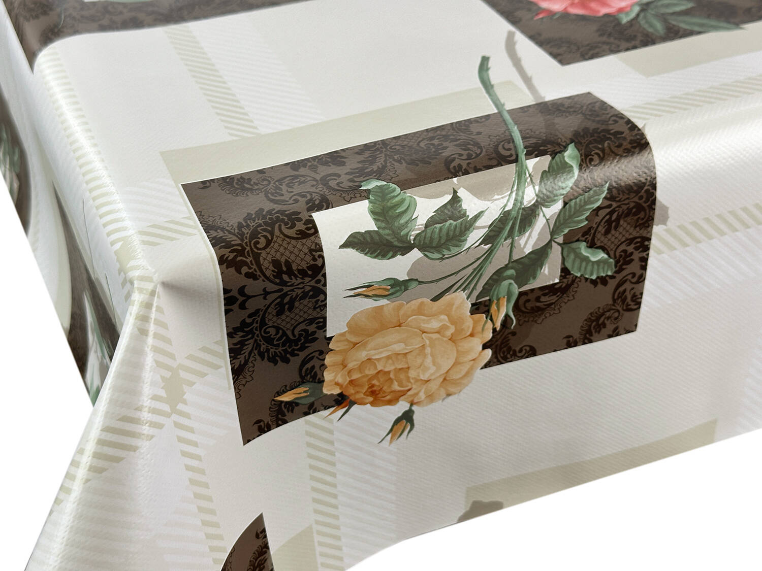 PVC ubrusy s textilním podkladem– stolové voskované plátno na textilnom podklade v závitoch šírky 140 cm, dĺžky 20 m. Zloženie: potlačená fólia 100% PVC na podklade zo 100% PP tkaniny. Oeko-Tex Standard 100.