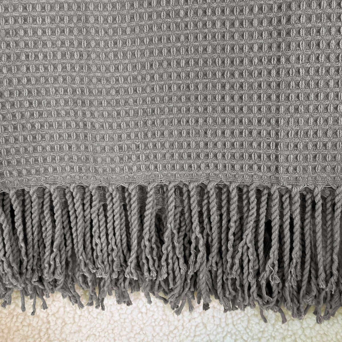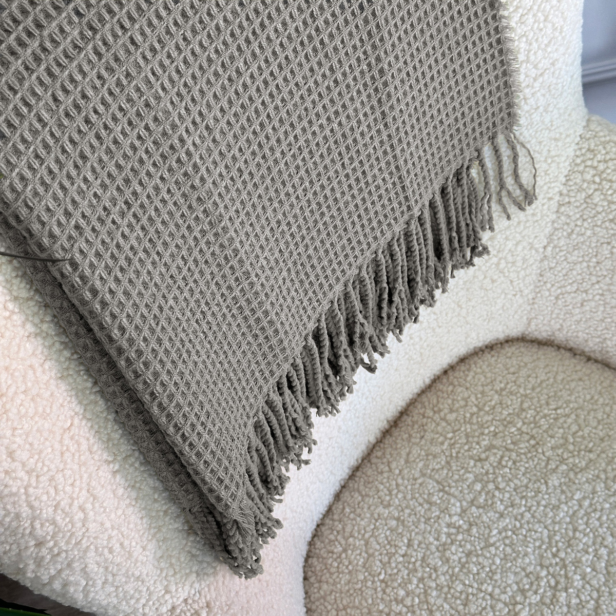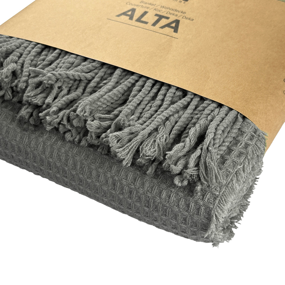 Prikrývka Alta je vyrobená z odolnej akrylovej priadze, ľahko sa udržiava a nekrčí sa. Jej výrazná vaflová štruktúra dodáva moderný a textúrovaný vzhľad. Dekoratívne brmbolce po okrajoch tvoria elegantný detail.
