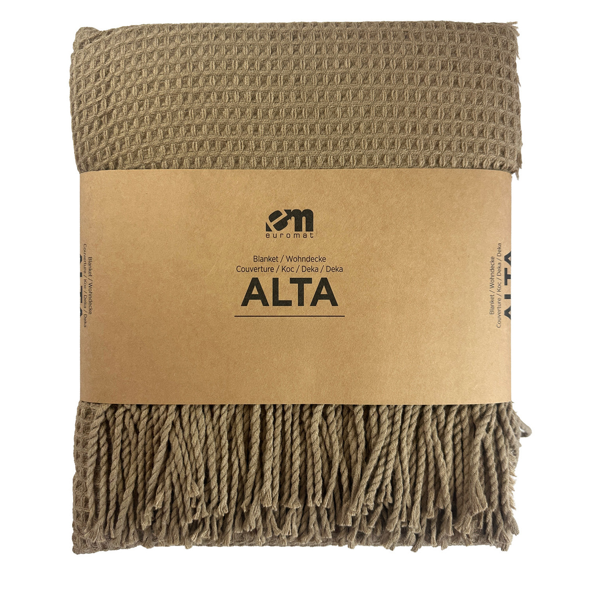 Prikrývka Alta je vyrobená z odolnej akrylovej priadze, ľahko sa udržiava a nekrčí sa. Jej výrazná vaflová štruktúra dodáva moderný a textúrovaný vzhľad. Dekoratívne brmbolce po okrajoch tvoria elegantný detail.